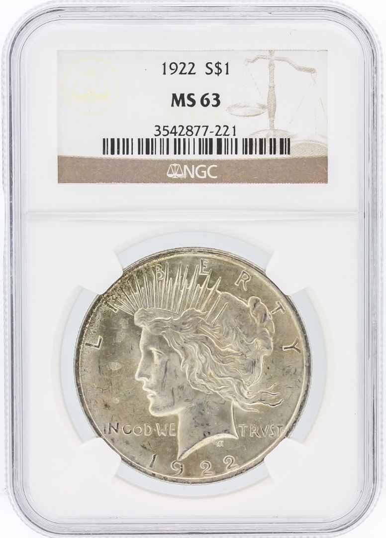 One 1922 NGC MS63 Peace Silver Dollar. NGC Certified.