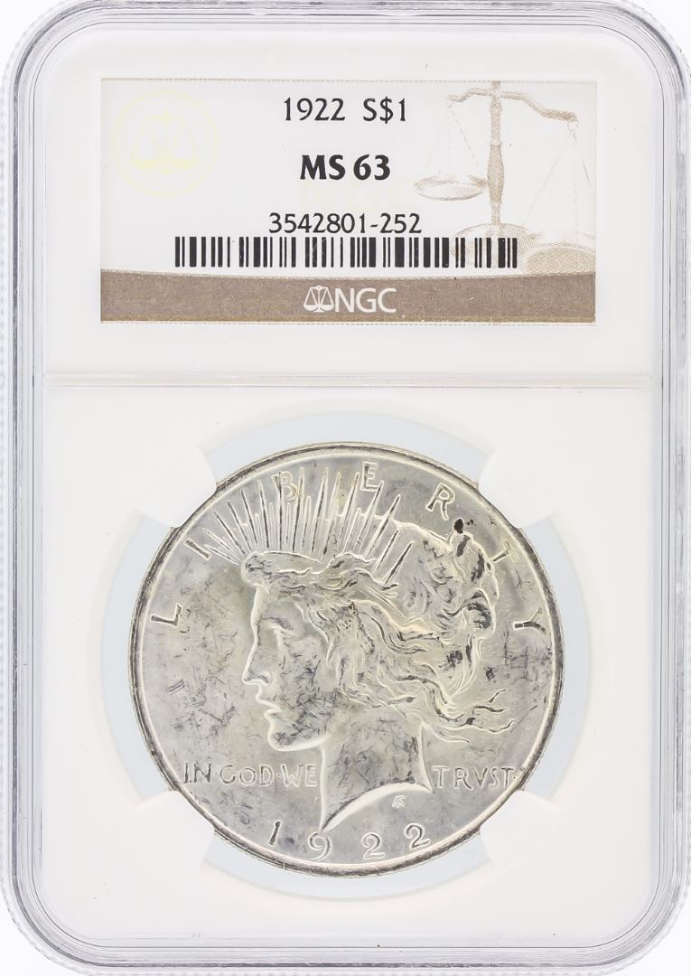 One 1922 NGC MS63 Peace Silver Dollar. NGC Certified.