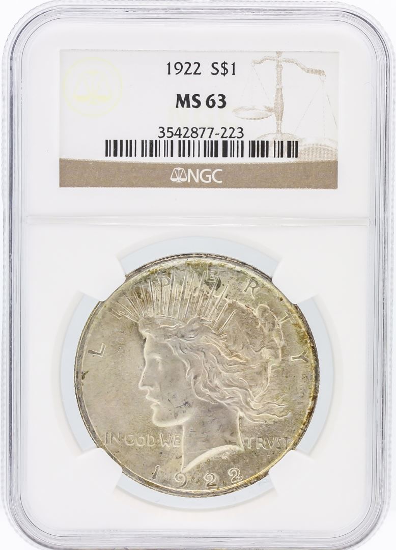 One 1922 NGC MS63 Peace Silver Dollar. NGC Certified.