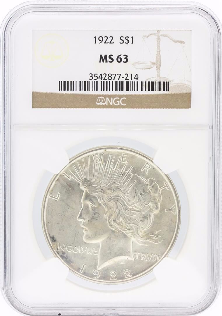One 1922 NGC MS63 Peace Silver Dollar. NGC Certified.