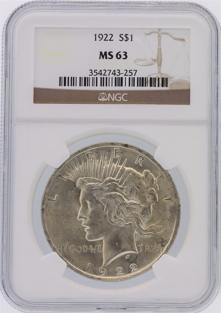 One 1922 NGC MS63 Peace Silver Dollar. NGC Certified.