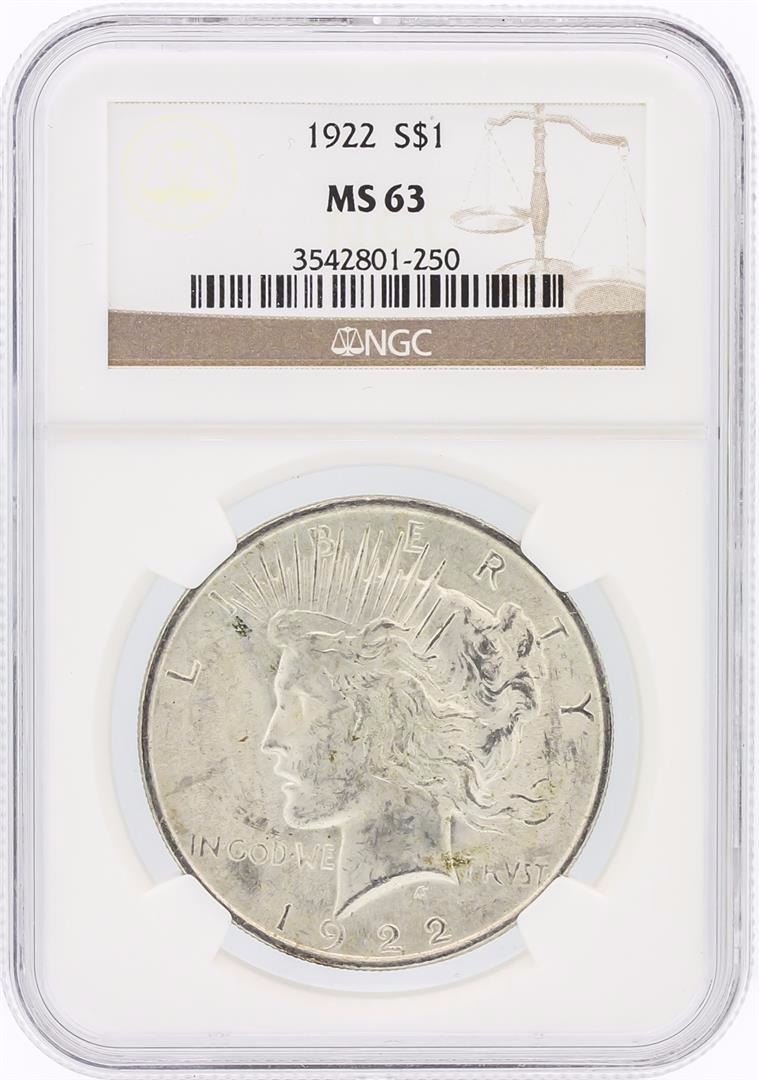 One 1922 NGC MS63 Peace Silver Dollar. NGC Certified.