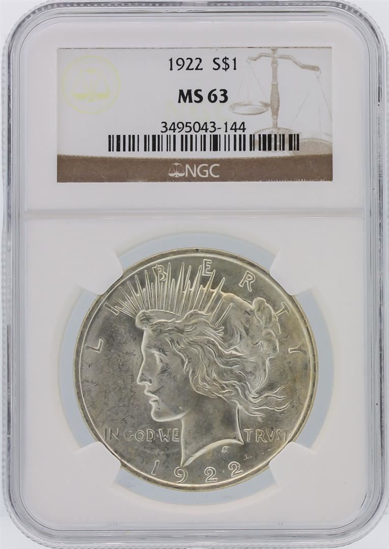 One 1922 NGC MS63 Peace Silver Dollar. NGC Certified.