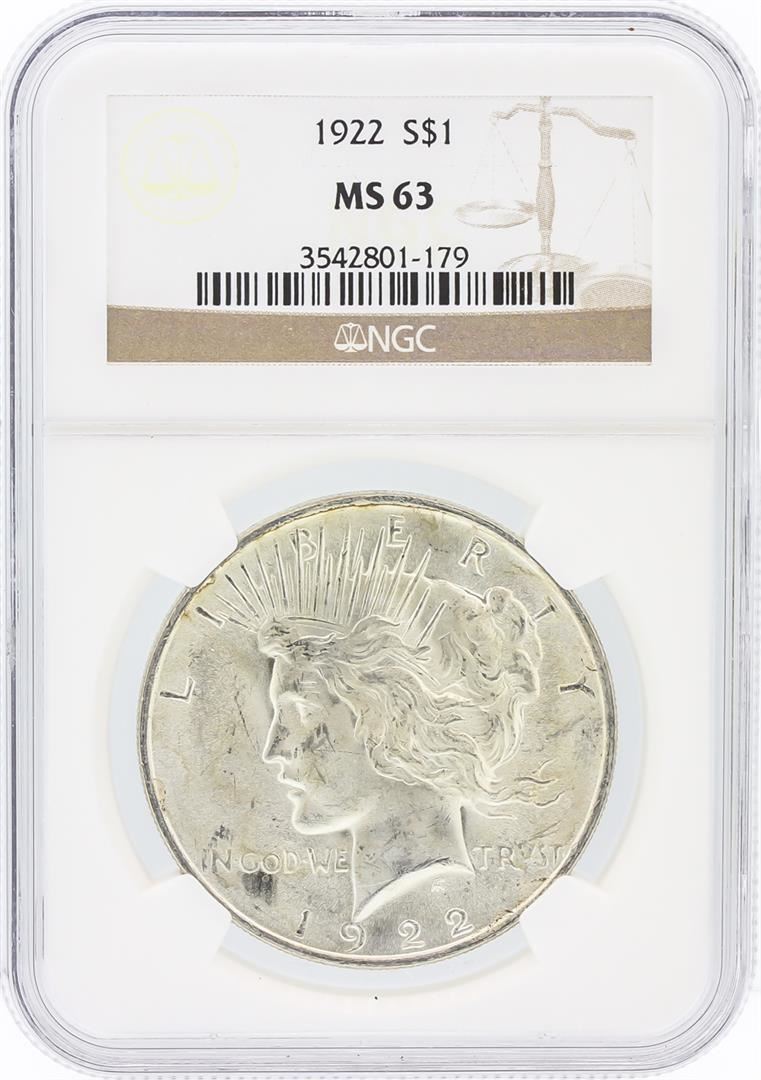 One 1922 NGC MS63 Peace Silver Dollar. NGC Certified.
