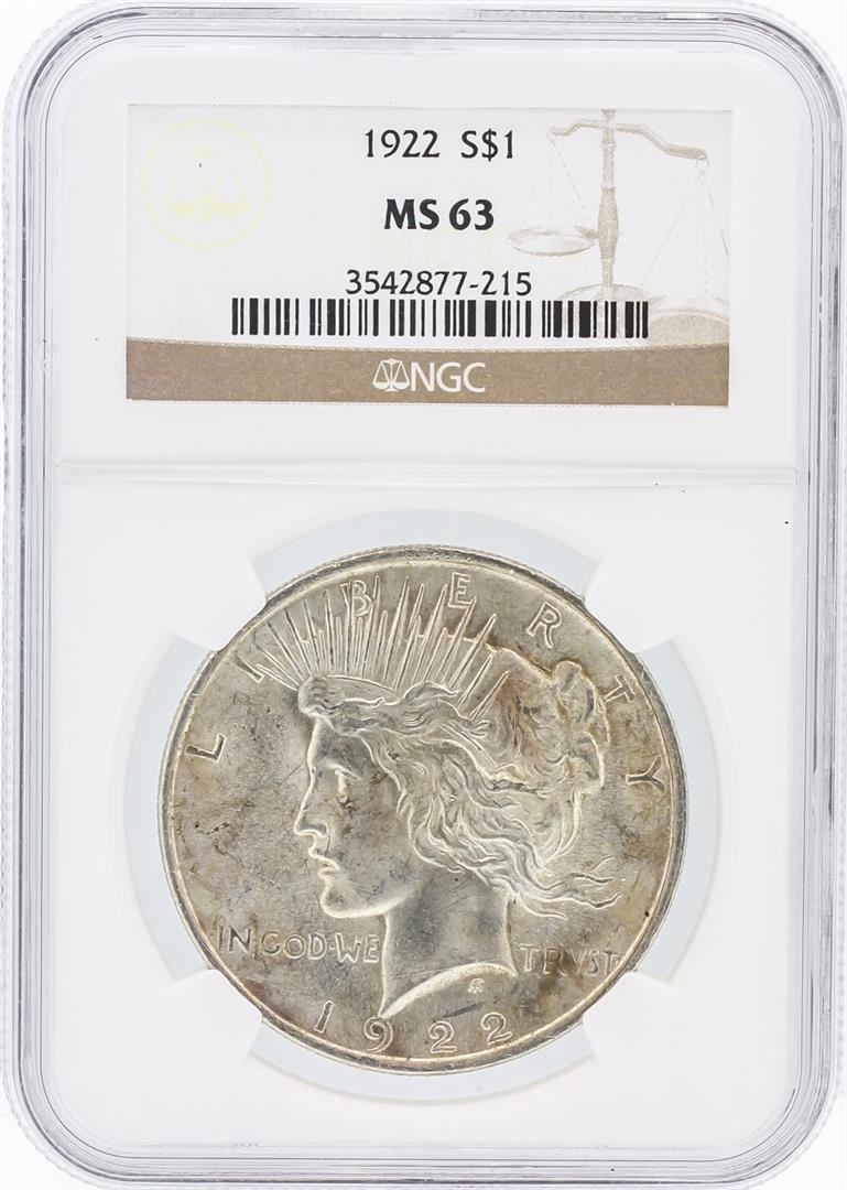 One 1922 NGC MS63 Peace Silver Dollar. NGC Certified.