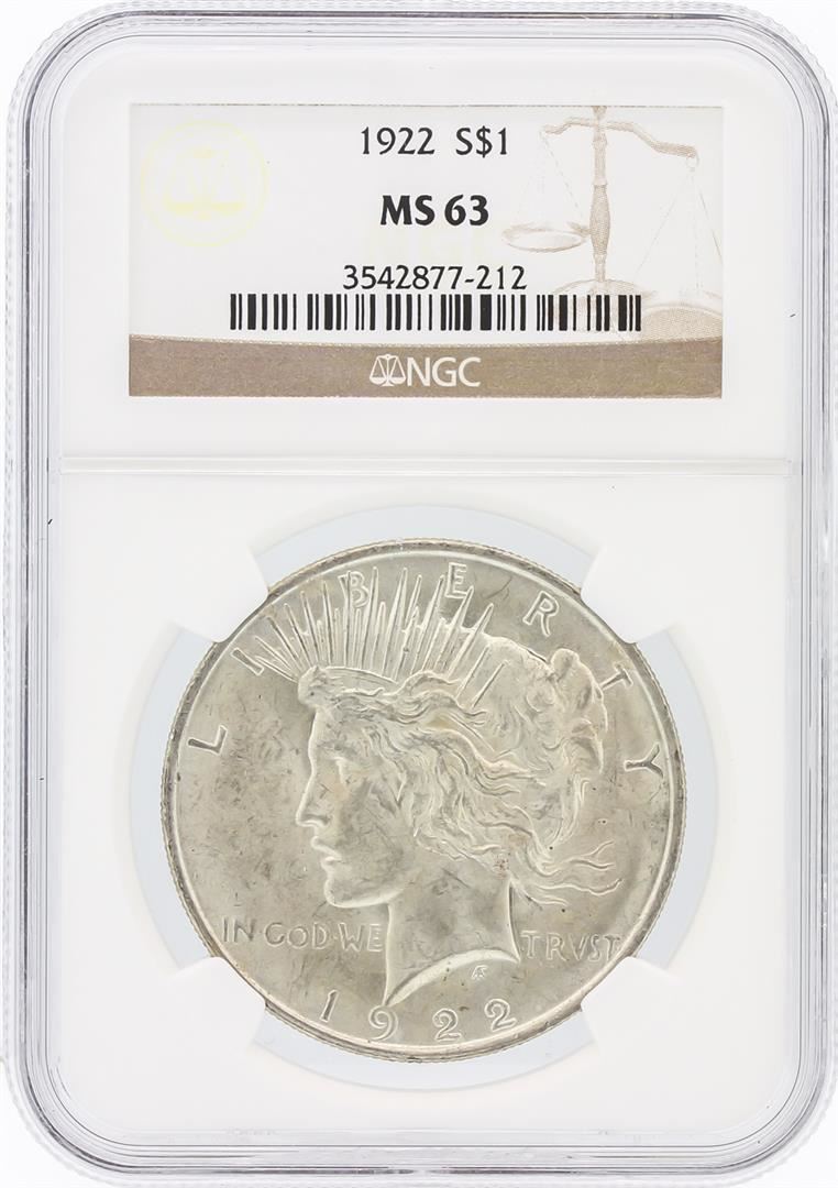 One 1922 NGC MS63 Peace Silver Dollar. NGC Certified.
