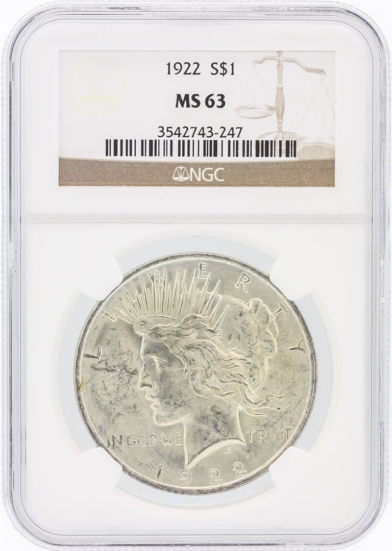 One 1922 NGC MS63 Peace Silver Dollar. NGC Certified.