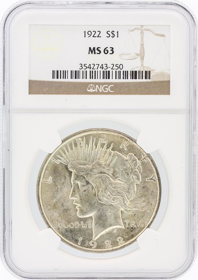 One 1922 NGC MS63 Peace Silver Dollar. NGC Certified.