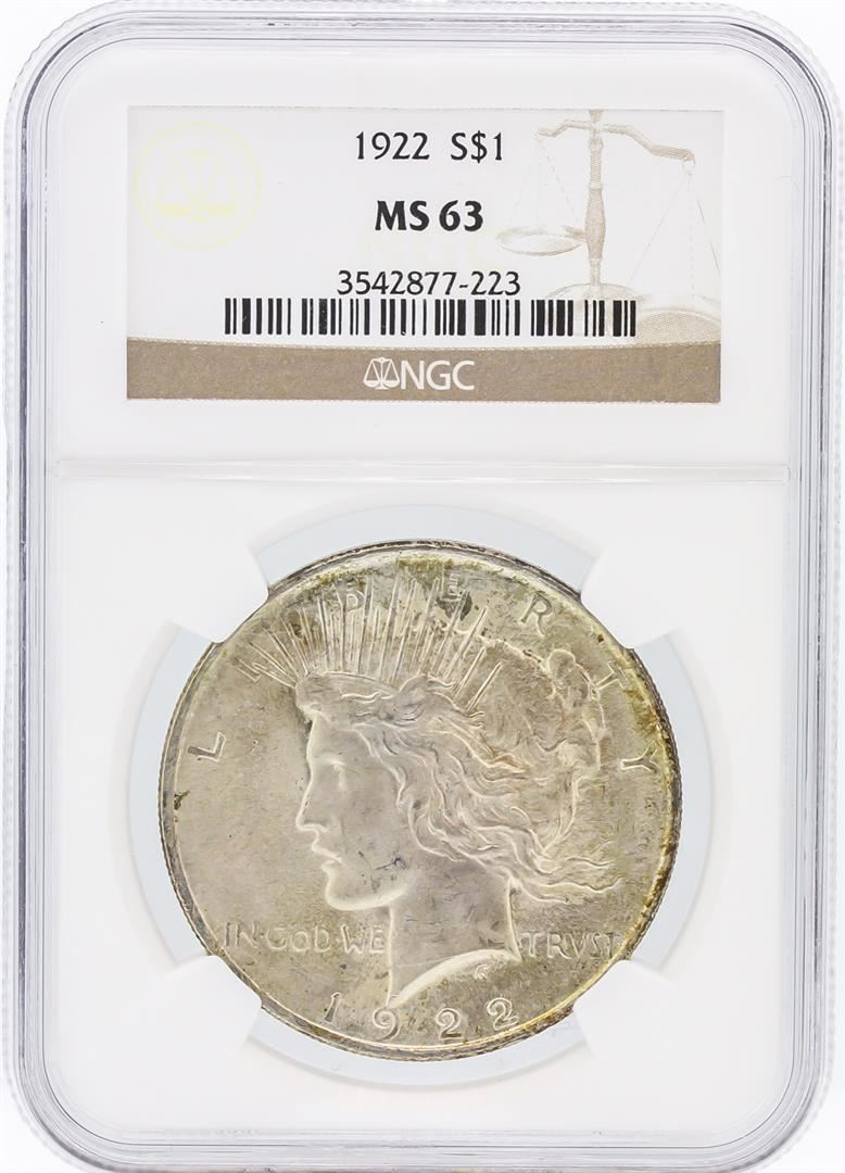 One 1922 NGC MS63 Peace Silver Dollar. NGC Certified.