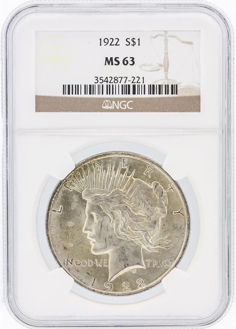 One 1922 NGC MS63 Peace Silver Dollar. NGC Certified.