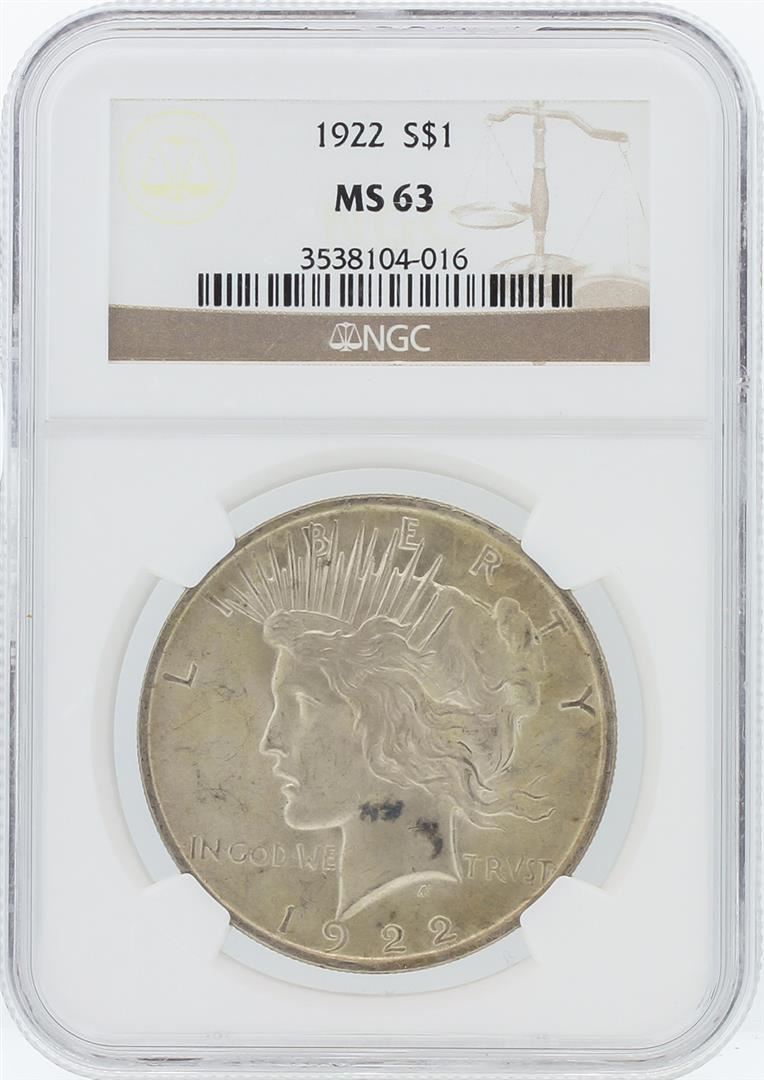 One 1922 NGC MS63 Peace Silver Dollar. NGC Certified.