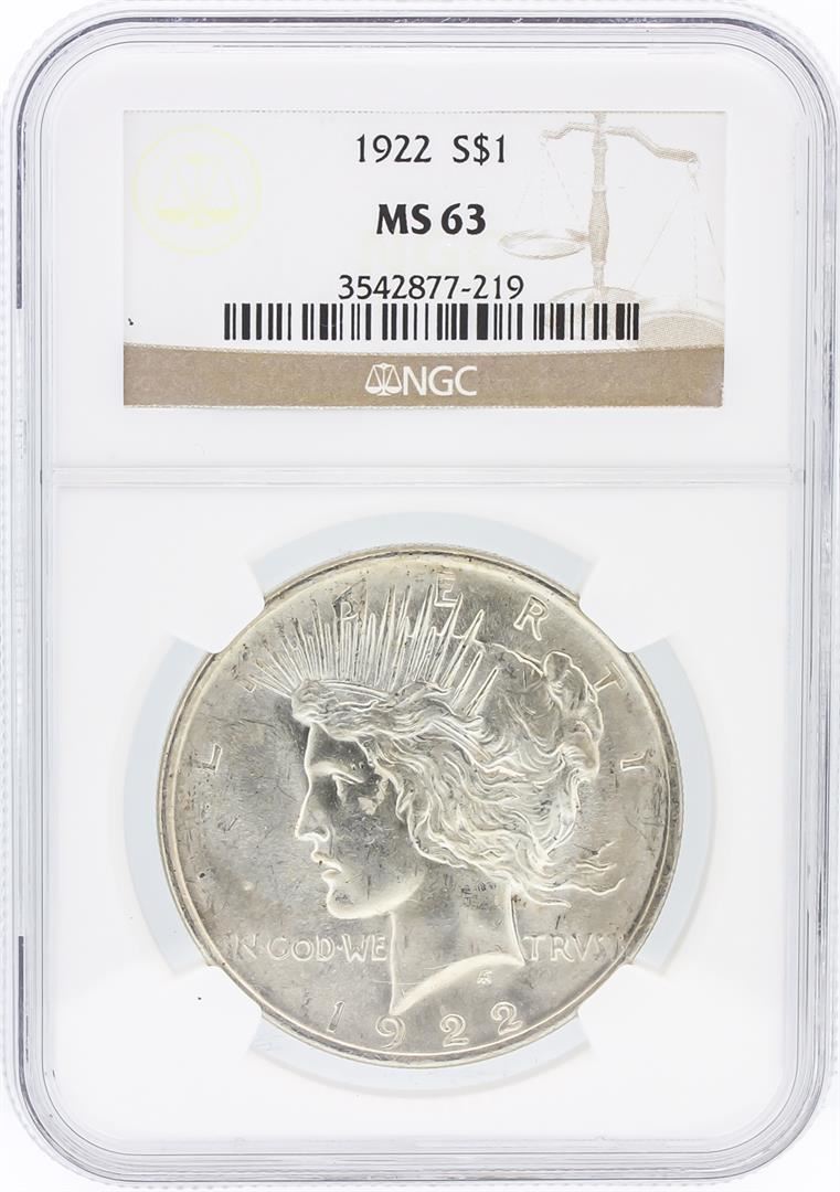 One 1922 NGC MS63 Peace Silver Dollar. NGC Certified.