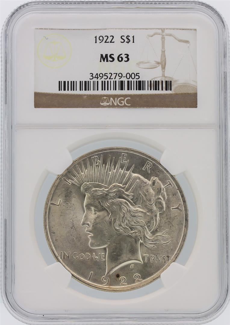 One 1922 NGC MS63 Peace Silver Dollar. NGC Certified.