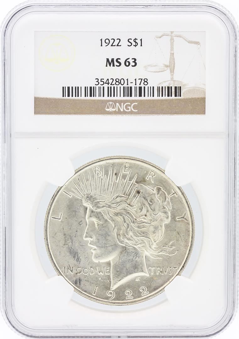 One 1922 NGC MS63 Peace Silver Dollar. NGC Certified.