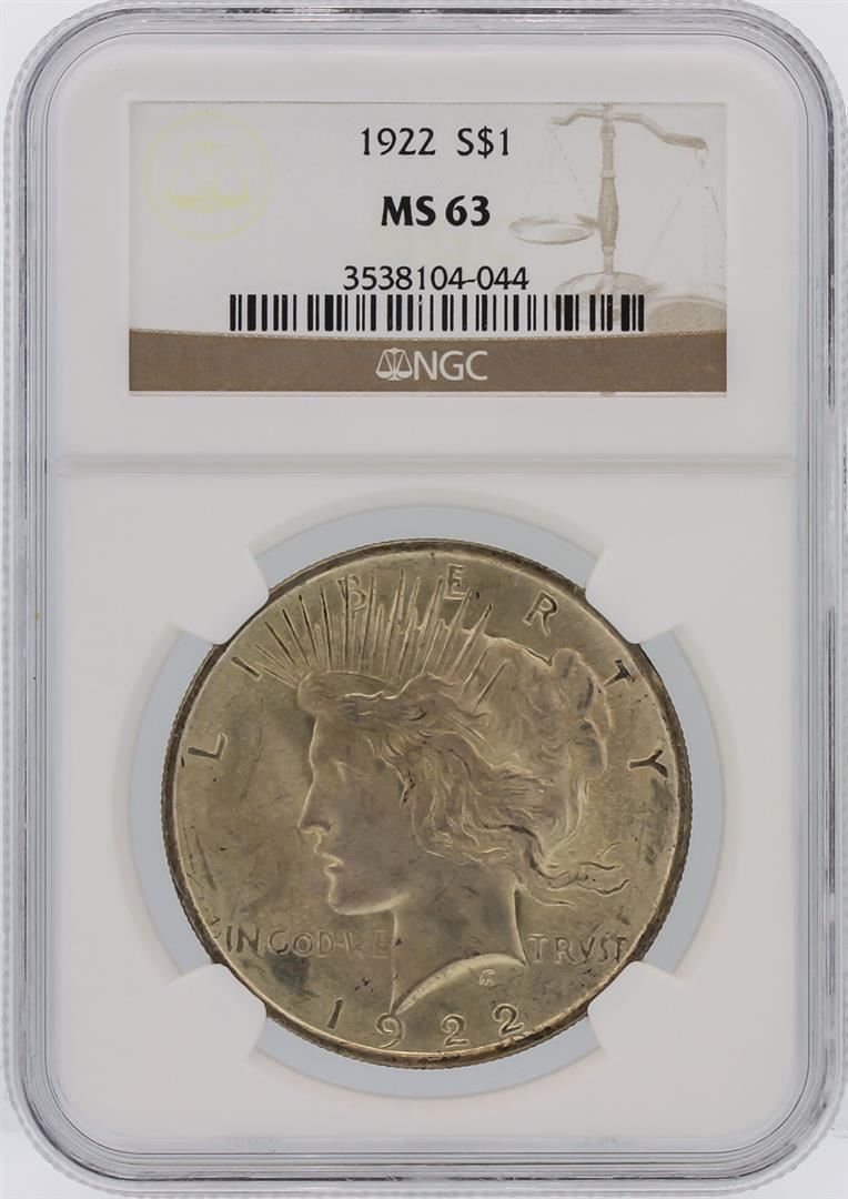 One 1922 NGC MS63 Peace Silver Dollar. NGC Certified.