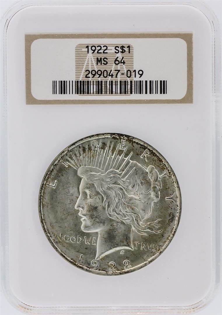 One 1922 NGC MS64 Peace Silver Dollar. NGC Certified.