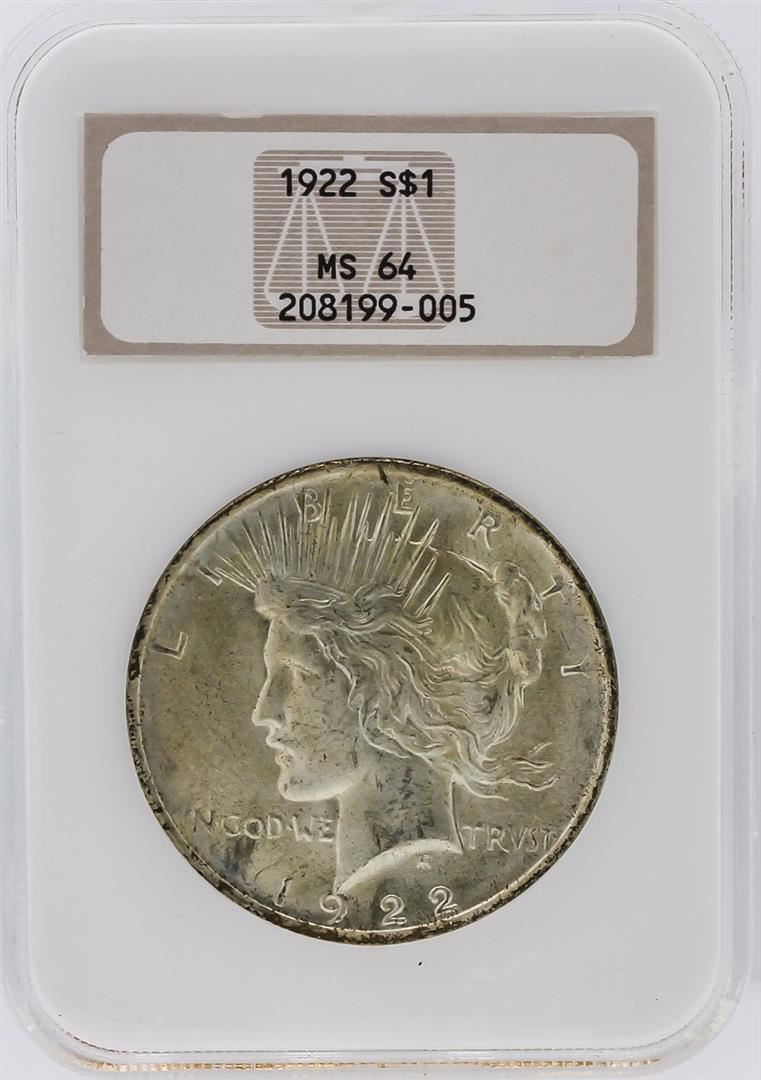 One 1922 NGC MS64 Peace Silver Dollar. NGC Certified.