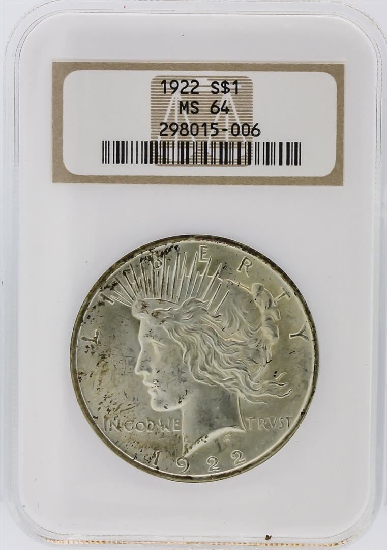 One 1922 NGC MS64 Peace Silver Dollar. NGC Certified.