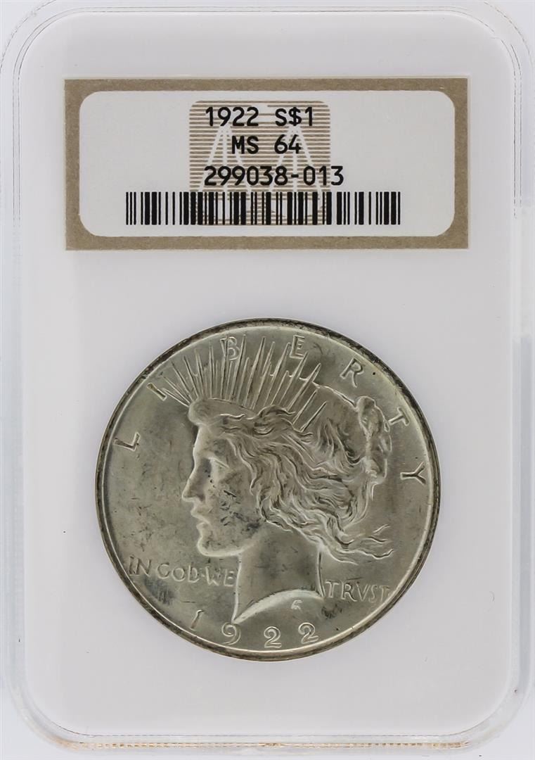 One 1922 NGC MS64 Peace Silver Dollar. NGC Certified.