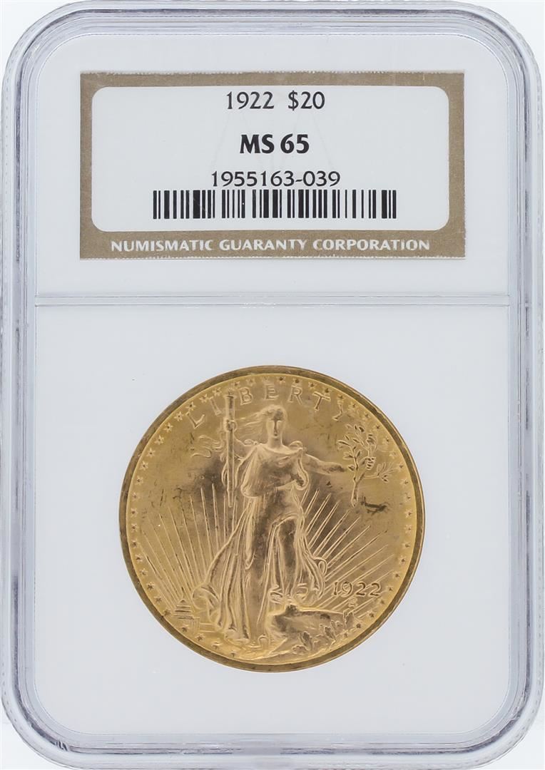 One 1922 NGC MS65 $20 St. Gaudens Double Eagle Gold Coin. Gem examples like this one are extremely rare and not easily found making this coin an attraction to any serious coin collector. NGC Certified.