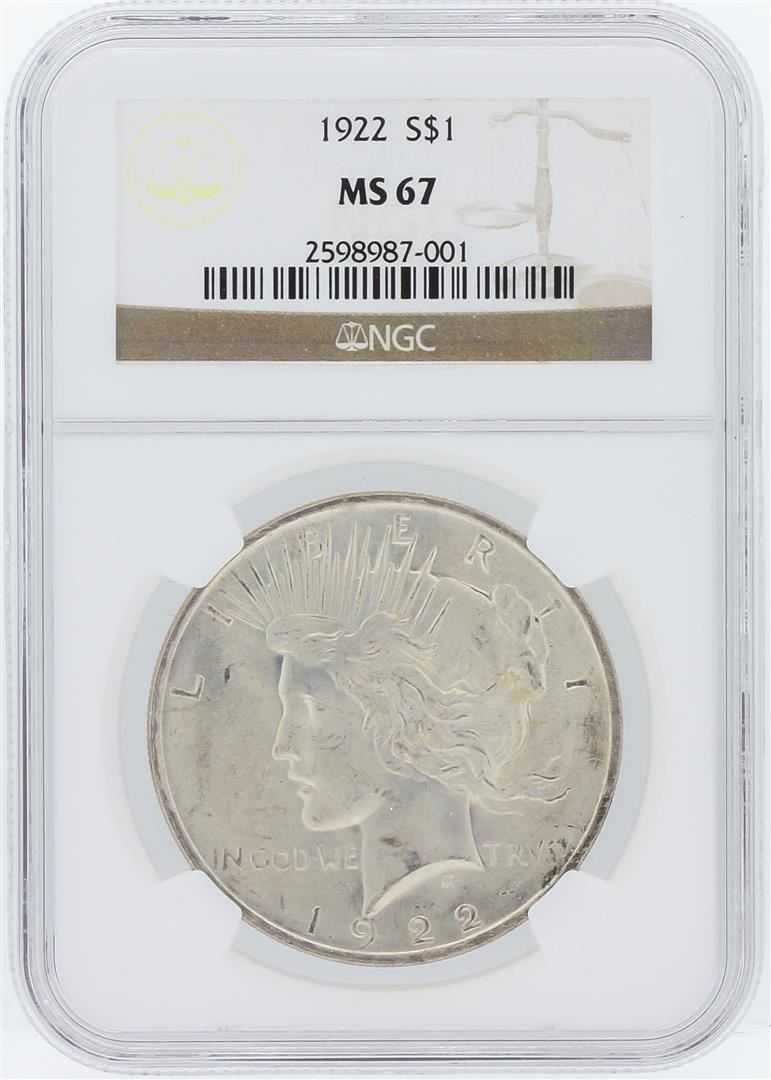 One 1922 NGC MS67 Peace Silver Dollar. NGC Certified.