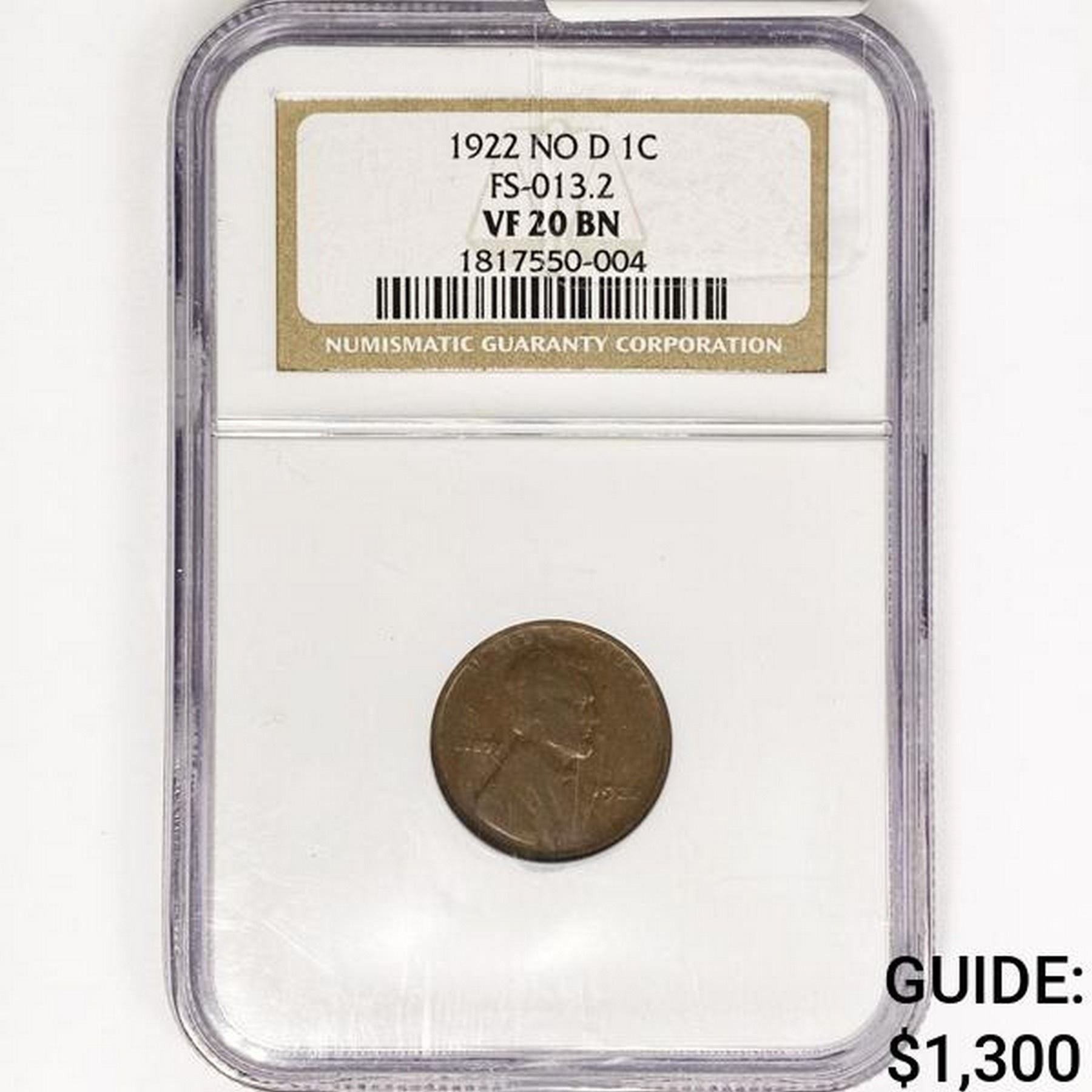 1922 NO D Wheat Cent NGC VF20 BN FS-013.2