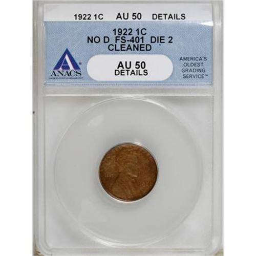 <B>1922 No D 1C Strong Reverse--Cleaned--ANACS. AU50 Details.</B></I> Die Pair 2. FS-401. The obverse color is a bit unnatural, but this is still a nice coin, with a glossy brown reverse that shows few impairments and bold wheat ears, as expected for the grade and variety.<BR><BR><B>Coin Engraver:</B> Victor D. Brenner<BR><BR><b>Shipping:</b> Coins & Currency (<a target="_blank" href="http://www.heritageauctions.com/common/shipping.php">view shipping information</a>)