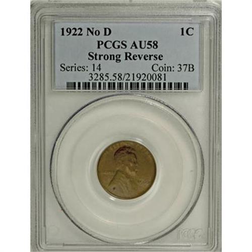 <B>1922 No D 1C Strong Reverse AU58 PCGS.</B></I> FS-401, formerly FS-013.2. Die Pair 2. The deep walnut-brown surfaces of this attractive Strong Reverse cent show elements of cerulean on the reverse. While the glossy obverse is ill-defined as always, on the reverse, the lines of the wheat ears are bold, and the devices show only a hint of friction. Population: 40 in 58, 36 finer (3/08).<BR><BR><B>Coin Engraver:</B> Victor D. Brenner<BR><BR><b>Shipping:</b> Coins & Currency (<a target="_blank" href="http://www.heritageauctions.com/common/shipping.php">view shipping information</a>)