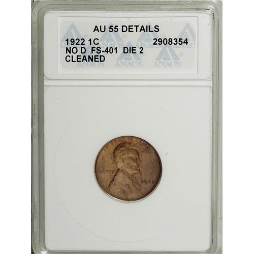 <B>1922 No D 1C Strong Reverse--Cleaned--ANACS. AU55 Details.</B></I> FS-401, formerly FS-013.2. Die Pair 2. Copper-gold surfaces are lightly hairlined. Nicely struck throughout. The most desirable of the three die marriages.<BR><BR><b>Shipping:</b> Coin/Currency (<a target="_blank" href="http://www.heritageauctions.com/common/shipping.php">view shipping information</a>)