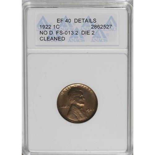 <B>1922 No D<1C> Strong Reverse--Cleaned--ANACS. XF40 Details.</B></I> FS-013.2. A hairlined and recolored dusky gold example of this famous variety. The reverse shows scant indication of highpoint wear.