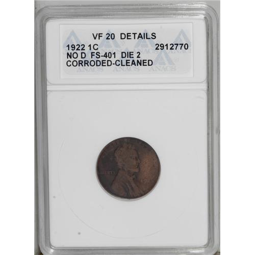 <B>1922 No D 1C Strong Reverse--Corroded, Cleaned--ANACS. VF20 Details.</B></I> FS-013.2. Die Pair 2. The left obverse is significantly darker than the rest of the piece, likely due to corrosion. The significantly worn medium-brown surfaces are unnaturally luminous.<BR><I>From The Jones Beach Collection.</B></I><BR><BR><b>Shipping:</b> Coin/Currency (<a target="_blank" href="http://www.heritageauctions.com/common/shipping.php">view shipping information</a>)