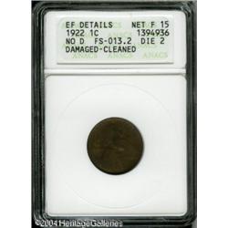 1922 No D 1C Strong Reverse--Damaged, Cleaned--ANACS <B>1922 No D 1C Strong Reverse--Damaged, Cleaned--ANACS. XF Details, Net Fine 15.</B></I> FS-013.2, Die Pair 2. Light brown surfaces display several small punch marks and scratches on the obverse. <BR><BR><B>Important notice:</B> Heritage usually auctions material at the rate of 200-250 lots per hour. On some occasions eBay Live bid software or the Internet may not be able to keep up with the pace of the auction. We recommend placing a realistic absentee bid now as insurance to avoid disappointment. Occasionally the auctioneer may eliminate or reject an eBay Live bid, and the auctioneer may also reopen a lot after the close of the eBay live bidding (usually because we missed an audience bid), and may reject your bid even if it shows you as the winning bidder. By bidding via eBay Live, you agree that Heritage may award the lot to another bidder at its sole discretion under the circumstances described above or any other reasonable circumstances. Since eBay bids are not shown to us until we open the lot on the floor, we treat those bids just like floor bids. In most cases the floor responds before the eBay bid is presented to us, due to Internet lag time, so for consistency we have made it a policy that floor bids are always considered first over tie eBay live bids. Also please note that all Heritage lots purchased through eBay Live carry a 20% Buyer's Premium. Please make sure you read the Terms and Conditions before you bid. This lot is being auctioned in conjunction with a live floor auction by Heritage Galleries & Auctioneers. All final auction and invoice information will be supplied by Heritage Galleries & Auctioneers, and all other information should be considered preliminary. Lot:5290