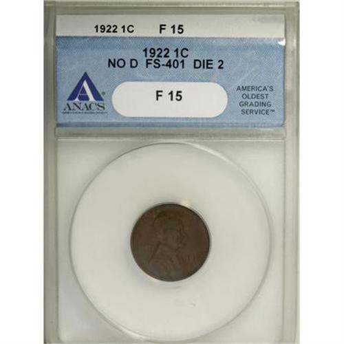 <B>1922 No D 1C Strong Reverse Fine 15 ANACS.</B></I> FS-401. Die 2. Even in the Fine 15 grade, the bold second 2 in the date and clear lines on the wheat ear confirm this important variety. As expected, this chocolate-brown cent has sharper detail on the reverse.<BR><BR><B>Coin Engraver:</B> Victor D. Brenner<BR><BR><b>Shipping:</b> Coins & Currency (<a target="_blank" href="http://www.heritageauctions.com/common/shipping.php">view shipping information</a>)