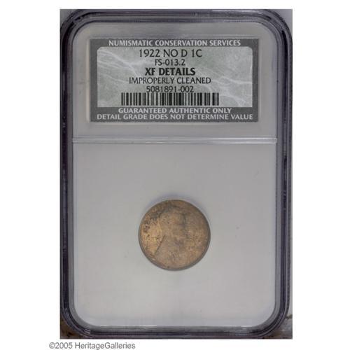 <B>1922 No D<1C> Strong Reverse--Improperly Cleaned--NCS. XF Details.</B></I> The reverse displays little actual wear, but this key date Cent has unnatural bright gold and rose color, and the fields have an occasionally striated appearance from the harsh cleaning. Both sides have some carbon, more noticeable on the upper left obverse. The left reverse exhibits a fingerprint fragment.