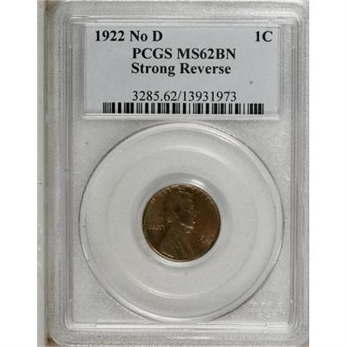 <B>1922 No D 1C Strong Reverse MS62 Brown PCGS.</B></I> Die Pair #2. For most dates in the Lincoln cent series, the appearance of a coin without a mintmark is little surprise; after all, the main Mint at Philadelphia does not use a mintmark. This rule, like many others in numismatics, has its exception: the cents of 1922 that lack a mintmark were not struck at Philadelphia, but rather at Denver. Three die pairs have been associated with this phenomenon, and while all command some level of premium, Die Pair #2, the Strong Reverse variant, is the most coveted.<BR> On this rosewood and violet example, subtle pumpkin accents visit the luminous fields. The obverse shows poor definition as always, but the boldly impressed reverse leaves no doubt as to this coin's desirability. Though a number of wispy abrasions on each side preclude a finer grade, the overall visual appeal is excellent.<BR><BR><B>Coin Engraver:</B> Victor D. Brenner<BR><BR><b>Shipping:</b> Coins & Currency (<a target="_blank" href="http://www.heritageauctions.com/common/shipping.php">view shipping information</a>)