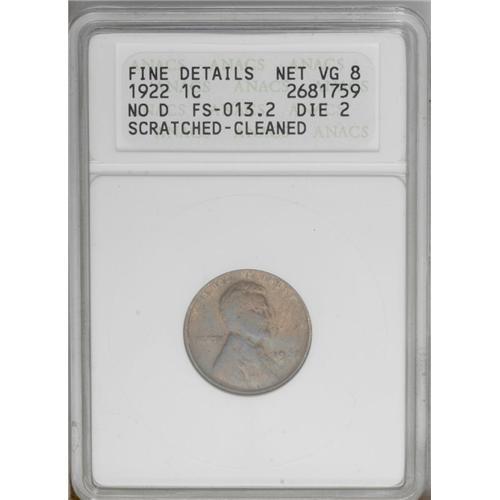 <B>1922 No D<1C> Strong Reverse--Scratched, Cleaned--ANACS. Fine Details, Net VG8.</B></I> An unnaturally bright example with dubious blue-green, rose, and gold hues. Both sides have several inexplicable pinscratches. <BR><BR><B>Important notice:</B> Heritage usually auctions material at the rate of 200-250 lots per hour. On some occasions eBay Live bid software or the Internet may not be able to keep up with the pace of the auction. We recommend placing a realistic absentee bid now as insurance to avoid disappointment. Occasionally the auctioneer may eliminate or reject an eBay Live bid, and the auctioneer may also reopen a lot after the close of the eBay live bidding (usually because we missed an audience bid), and may reject your bid even if it shows you as the winning bidder. By bidding via eBay Live, you agree that Heritage may award the lot to another bidder at its sole discretion under the circumstances described above or any other reasonable circumstances. Since eBay bids are not shown to us until we open the lot on the floor, we treat those bids just like floor bids. In most cases the floor responds before the eBay bid is presented to us, due to Internet lag time, so for consistency we have made it a policy that floor bids are always considered first over tie eBay live bids. Also please note that all Heritage lots purchased through eBay Live carry a 20% Buyer's Premium. Please make sure you read the Terms and Conditions before you bid. This lot is being auctioned in conjunction with a live floor auction by Heritage Galleries & Auctioneers. All final auction and invoice information will be supplied by Heritage Galleries & Auctioneers, and all other information should be considered preliminary. Lot:636 <BR><BR><B>Winning Notification and Billing:</B> After the FINAL session in this auction is complete, Heritage will send e-mail and snail mail invoices. This process normally takes several days. All final auction and invoice information will be supplied by Heritage Galleries & Auctioneers, and all other information should be considered preliminary. <BR><BR>This auction will be conducted on a live auction floor and over the Internet through eBay Live. If you choose to place an absentee bid, please take a moment to <font color='#0000ff'><u><a href='http://pages.ebay.com/liveauctions/help/before/laabsentee.html'>learn how eBay Live absentee bidding works</a></u></font><font color='#000000'>