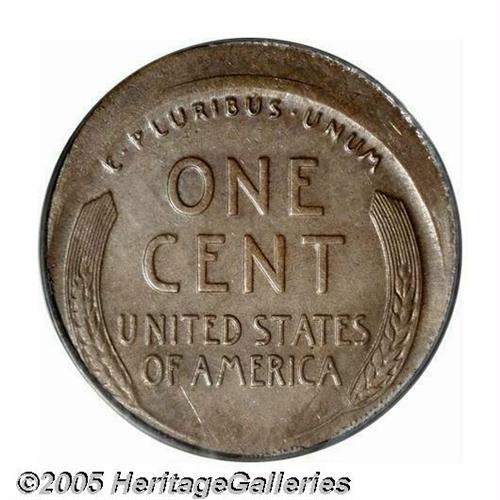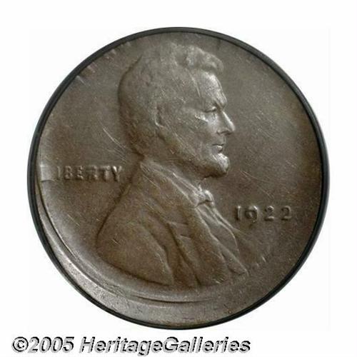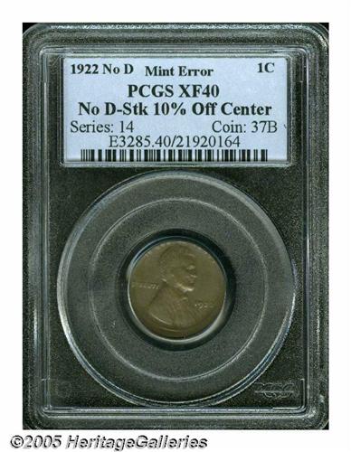 <B>1922 No D<1C> Strong Reverse--Struck 10% Off Center--XF40 PCGS.</B></I> FS-013.2. Die Pair #2. Struck moderately off center toward 12 o'clock, a portion of IN GOD WE TRUST is off the flan. The devices are fully present, although the lower left portion of the left wheat ear approaches the border. The L in LIBERTY and a few letters in E PLURIBUS UNUM are slightly distorted from unrestrained metal flow to the rim, as made and a characteristic of an off center strike. The 1922 No D Strong Reverse is obviously extremely rare struck off center, another example of similar sharpness may not exist. The undisturbed reverse has the details of a higher grade, a few faded obverse marks inflicted by a curious individual lead to a lower third party grade.<BR><I>From The Tom Mershon #2 All-Time PCGS Registry Set of Lincoln Wheat Cents.</B></I>