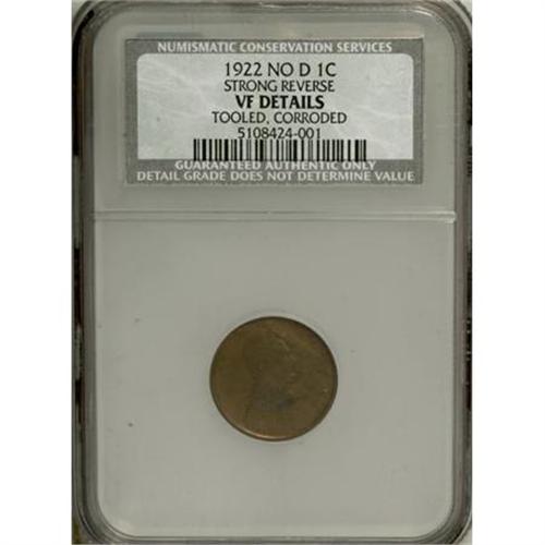 <B>1922 1C No D Strong Reverse--Corroded, Tooled--NCS. VF Details.</B></I><BR><BR><B>Coin Engraver:</B> Victor D. Brenner<BR><BR><b>Shipping:</b> Coins & Currency (<a target="_blank" href="http://www.heritageauctions.com/common/shipping.php">view shipping information</a>)