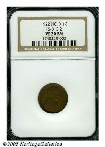 <B>1922 No D<1C> Strong Reverse VF20 NGC.</B></I> FS-013.2. A medium brown example that has no unpleasant marks or spots. The lines in the wheat ears are still relatively sharp despite 40 points of wear.