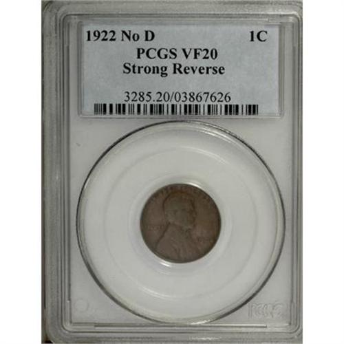 <B>1922 No D 1C Strong Reverse VF20 PCGS.</B></I> FS-401, formerly FS-013.2. Die Pair 2. TRUST and the final 2 in the date are sharp, characteristic of this key date cent. Chocolate-brown and olive toning blankets this lightly abraded example. The lines in the wheat ears are nearly fully separated.<BR><BR><B>Coin Engraver:</B> Victor D. Brenner<BR><BR><b>Shipping:</b> Coins & Currency (<a target="_blank" href="http://www.heritageauctions.com/common/shipping.php">view shipping information</a>)