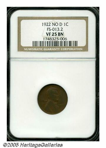 <B>1922 No D<1C> Strong Reverse VF25 NGC.</B></I> FS-013.2. Dusky golden-brown in color, this key date Cent has pleasing sharpness on the reverse. The obverse legends are blurry (as produced) but remain legible. Several small handling marks on the obverse do not especially distract.