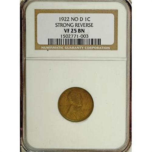 <B>1922 No D 1C Strong Reverse VF25 NGC.</B></I> Die Pair #2. The bold definition of the wheat ears, visible despite this coin's moderate wear, is diagnostic. An attractive chocolate-brown example of this popular variant, one that inspired a search for 1922 cents struck at Philadelphia despite that Mint's denials that it had produced the denomination that year.<BR><BR><B>Coin Engraver:</B> Victor D. Brenner<BR><BR><b>Shipping:</b> Coins & Currency (<a target="_blank" href="http://www.heritageauctions.com/common/shipping.php">view shipping information</a>)