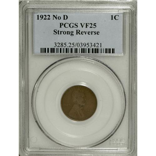<B>1922 No D 1C Strong Reverse VF25 PCGS.</B></I> FS-013.2. Die Pair 2. This golden-brown representative has few marks, and the lines in the wheat ears are primarily distinct. The sharp second 2 in the date confirms the widely pursued No D variety.<BR><BR><b>Shipping:</b> Coins & Currency (<a target="_blank" href="http://www.heritageauctions.com/common/shipping.php">view shipping information</a>)