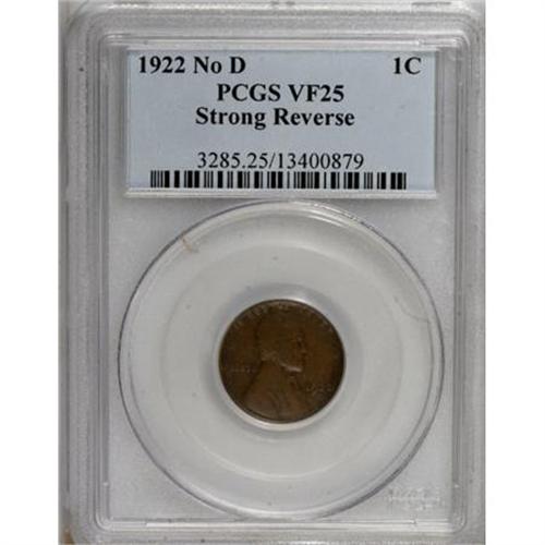 <B>1922 No D 1C Strong Reverse VF25 PCGS.</B></I> Die Pair #2. The Strong Reverse variant of the No D cent, sometimes called the "true" No D variety, is highly prized by collectors. This moderately worn, yet undeniably pleasing chocolate-brown piece sports a pleasing gloss and slight deepening of the surfaces near the rims.<BR><BR><B>Coin Engraver:</B> Victor D. Brenner<BR><BR><b>Shipping:</b> Coins & Currency (<a target="_blank" href="http://www.heritageauctions.com/common/shipping.php">view shipping information</a>)