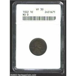 1922 No D 1C Strong Reverse VF30 ANACS. Deep purple-brown patina, with lighter tan color on the devices. The wheat ear lines have bold definition, and the fields are refreshingly unabraded. Important notice: We expect to be auctioning lots at the rate of 200-250 per hour. Sometimes eBay Premier live bid software cannot keep up with that pace, so we strongly recommend that you place a realistic proxy bid now as insurance to avoid disappointment. Also please note that all Heritage/CAA lots purchased through eBay Premier carry a 20% Buyer's Premium. Please make sure you read the Terms and Conditions.
