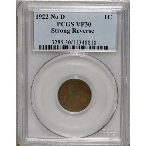 <B>1922 No D 1C Strong Reverse VF30 PCGS.</B></I> FS-013.2. Die Pair 2. The lines in the wheat ears are separated on this unmarked medium brown key date cent. A faint fingerprint is present near 10 o'clock on the reverse.<BR><BR><b>Shipping:</b> Coins & Currency (<a target="_blank" href="http://www.heritageauctions.com/common/shipping.php">view shipping information</a>)