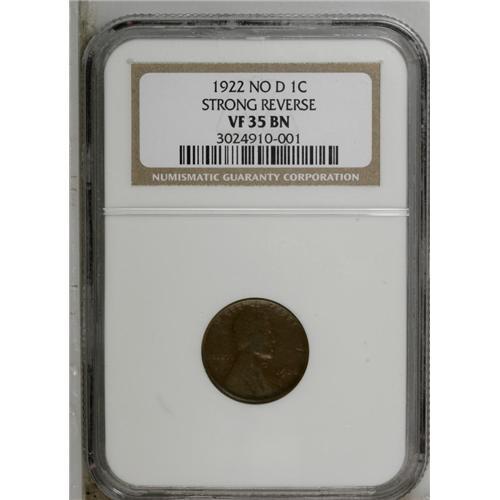 <B>1922 No D 1C Strong Reverse VF35 NGC.</B></I> FS-013.2. Die Pair 2. A Choice VF example with the well-defined reverse and mushy obverse that are hallmarks of this die pair. The chocolate-brown surfaces are largely untroubled.<BR><BR><b>Shipping:</b> Coin/Currency (<a target="_blank" href="http://www.heritageauctions.com/common/shipping.php">view shipping information</a>)