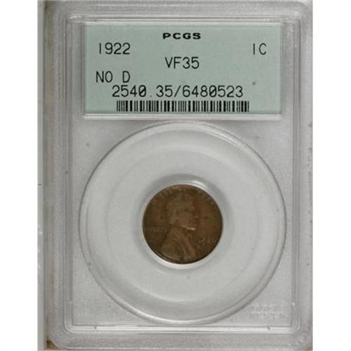 <B>1922 No D 1C Strong Reverse VF35 PCGS.</B></I> FS-013.2. Die Pair 2. While the number on the green-label insert now corresponds to the No D, Weak Reverse variant, the bold detail on the wheat ears leaves little doubt as to its Die Pair 2 origin. The chocolate-brown surfaces of this Choice VF piece show few marks and excellent eye appeal.<BR><BR><B>Coin Engraver:</B> Victor D. Brenner<BR><BR><b>Shipping:</b> Coins & Currency (<a target="_blank" href="http://www.heritageauctions.com/common/shipping.php">view shipping information</a>)