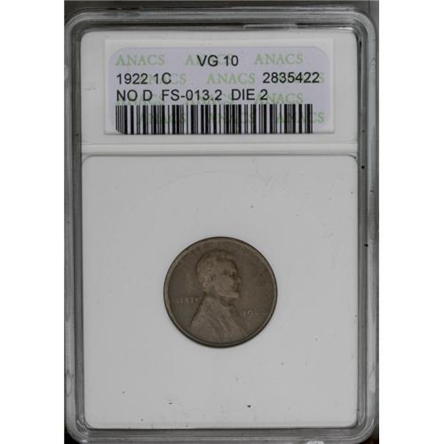 <B>1922 No D<1C> Strong Reverse VG10 ANACS.</B></I> FS-013.2. Die #2. A circulated chocolate-brown key date cent that retains some definition on the wheat ears. Minor marks are present but are of no importance for the grade. <BR><BR><B>Important notice:</B> Heritage usually auctions material at the rate of 200-250 lots per hour. On some occasions eBay Live bid software or the Internet may not be able to keep up with the pace of the auction. We recommend placing a realistic absentee bid now as insurance to avoid disappointment. Occasionally the auctioneer may eliminate or reject an eBay Live bid, and the auctioneer may also reopen a lot after the close of the eBay live bidding (usually because we missed an audience bid), and may reject your bid even if it shows you as the winning bidder. By bidding via eBay Live, you agree that Heritage may award the lot to another bidder at its sole discretion under the circumstances described above or any other reasonable circumstances. Since eBay bids are not shown to us until we open the lot on the floor, we treat those bids just like floor bids. In most cases the floor responds before the eBay bid is presented to us, due to Internet lag time, so for consistency we have made it a policy that floor bids are always considered first over tie eBay live bids. Also please note that all Heritage lots purchased through eBay Live carry a 20% Buyer's Premium. Please make sure you read the Terms and Conditions before you bid. This lot is being auctioned in conjunction with a live floor auction by Heritage Galleries & Auctioneers. All final auction and invoice information will be supplied by Heritage Galleries & Auctioneers, and all other information should be considered preliminary. Lot:637 <BR><BR><B>Winning Notification and Billing:</B> After the FINAL session in this auction is complete, Heritage will send e-mail and snail mail invoices. This process normally takes several days. All final auction and invoice information will be supplied by Heritage Galleries & Auctioneers, and all other information should be considered preliminary. <BR><BR>This auction will be conducted on a live auction floor and over the Internet through eBay Live. If you choose to place an absentee bid, please take a moment to <font color='#0000ff'><u><a href='http://pages.ebay.com/liveauctions/help/before/laabsentee.html'>learn how eBay Live absentee bidding works</a></u></font><font color='#000000'>