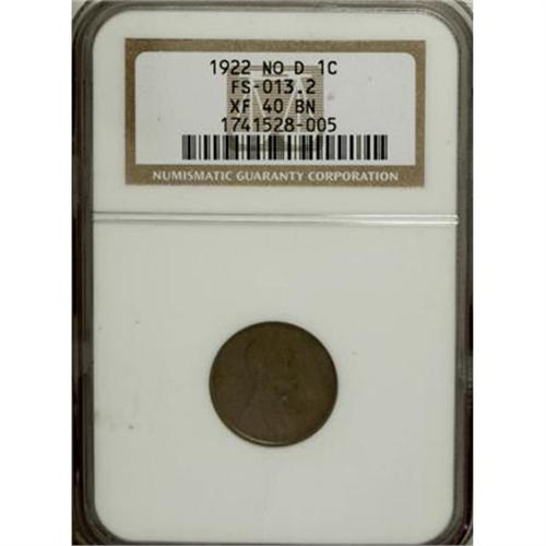 <B>1922 No D 1C Strong Reverse XF40 NGC.</B></I> FS-013.2. Sea-green and medium brown blend throughout this relatively mark-free key date cent. The lines within the wheat ears are sharp, as is the diagnostic second 2 in the date. The Denver mintmark was inadvertently removed from a worn obverse die before it was paired with a fresh reverse die to create this popular variety.<BR><BR><B>Coin Engraver:</B> Victor D. Brenner<BR><BR><b>Shipping:</b> Coins & Currency (<a target="_blank" href="http://www.heritageauctions.com/common/shipping.php">view shipping information</a>)